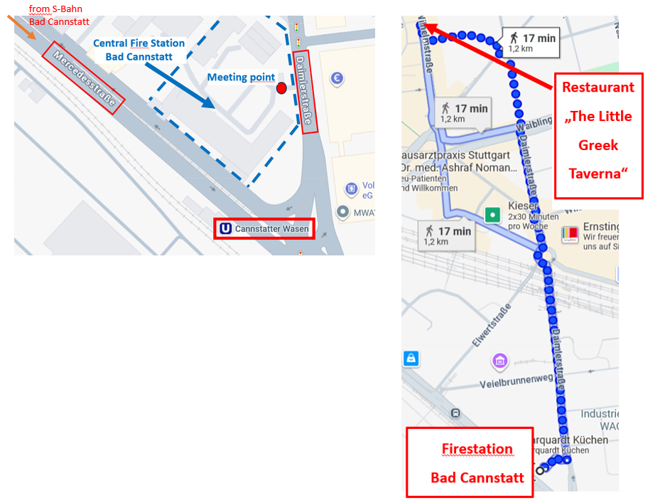 Public transportation: take either S-Bahn S1,S2,S3 and exit at the station Bad Cannstatt; from there it takes about 5 min to walk to the fire station; or take either Stadt-Bahn U11, U19 and exit at the station Cannstatter Wasen, the fire station is across the street.