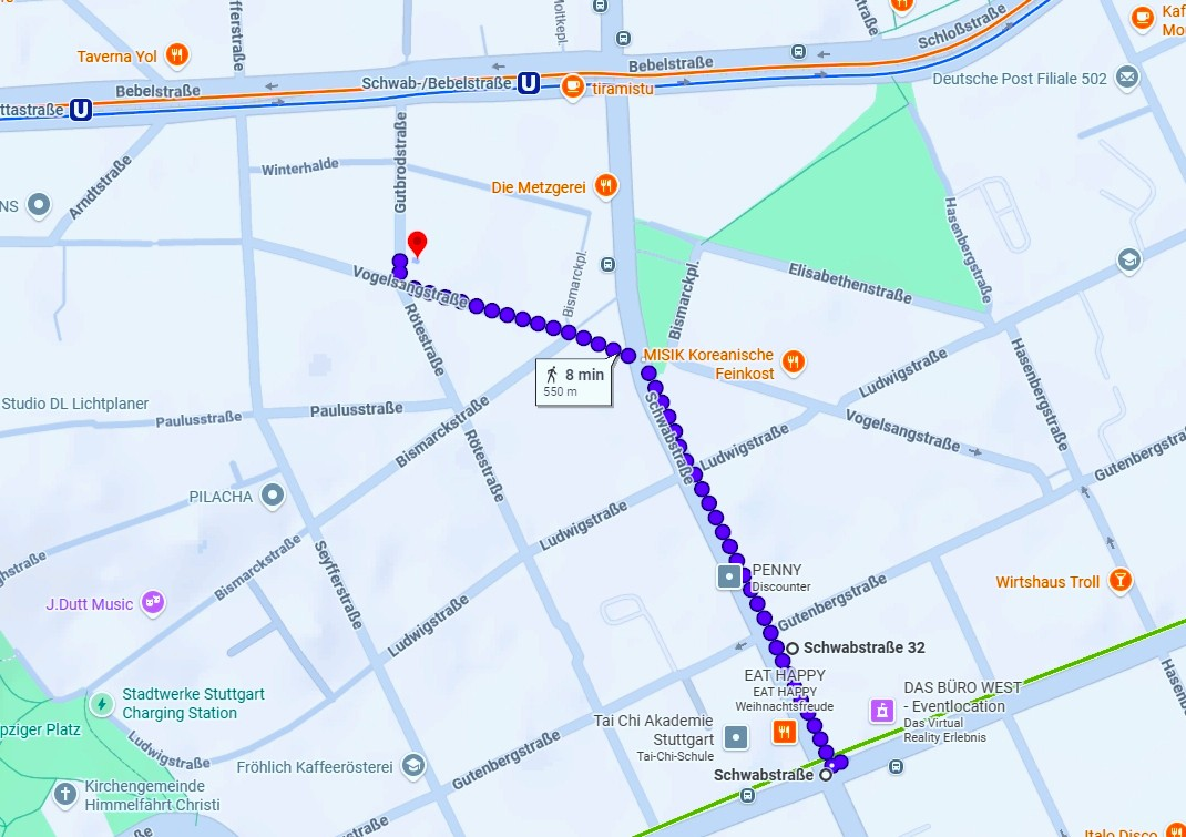 Public transportation (recommended): If coming via the Stuttgart Hbf, take the S1/4/5; if coming via Vaihingen, take the S1/2/3. Either way, get off at Schwabstr. If coming from within Stuttgart, it is also possible to take Bus 44. To get to the restaurant, walk 1 block up Schwabstr. to the corner of Gutenbergstr.
