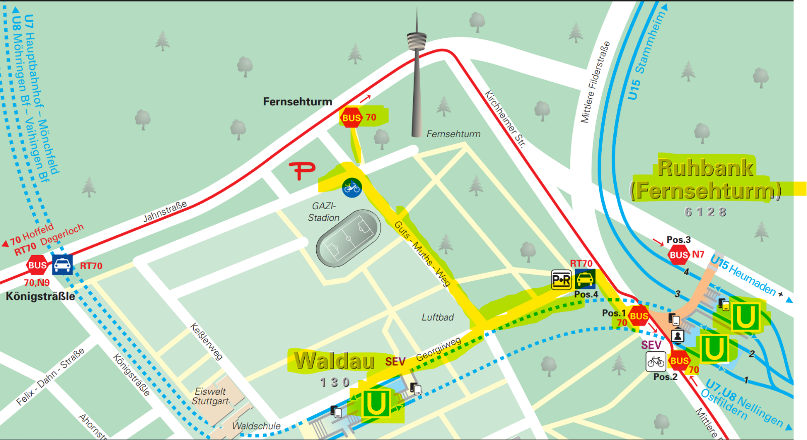 By Public Transport: U15 to stop “Ruhbank”; U7 to either stop “Waldau” or stop “Ruhbank”; Bus 70 to stop “Ruhbank” or “Fernsehturm”; all stops are within easy walking distance to the bus pick-up.